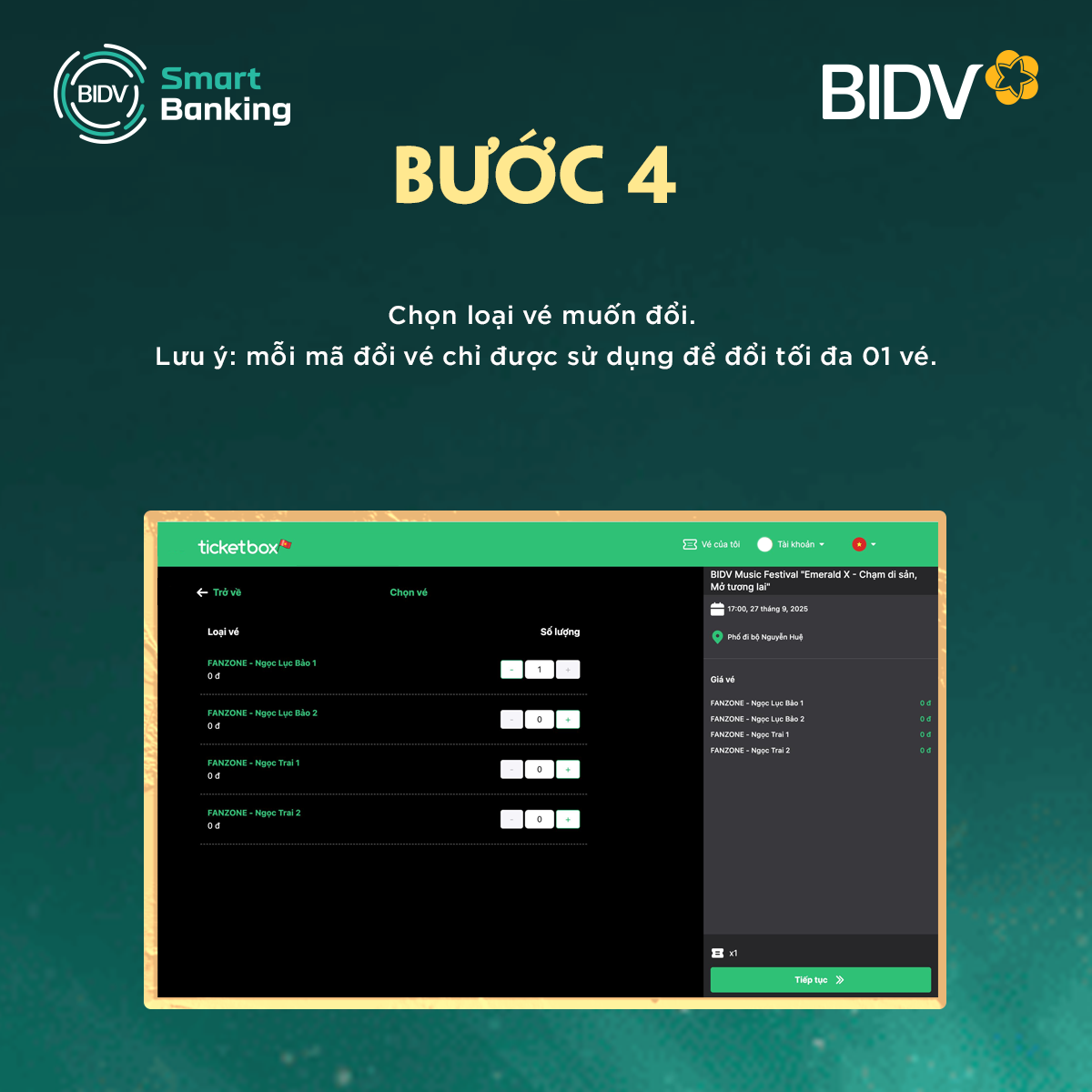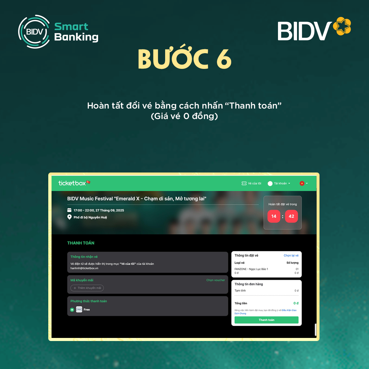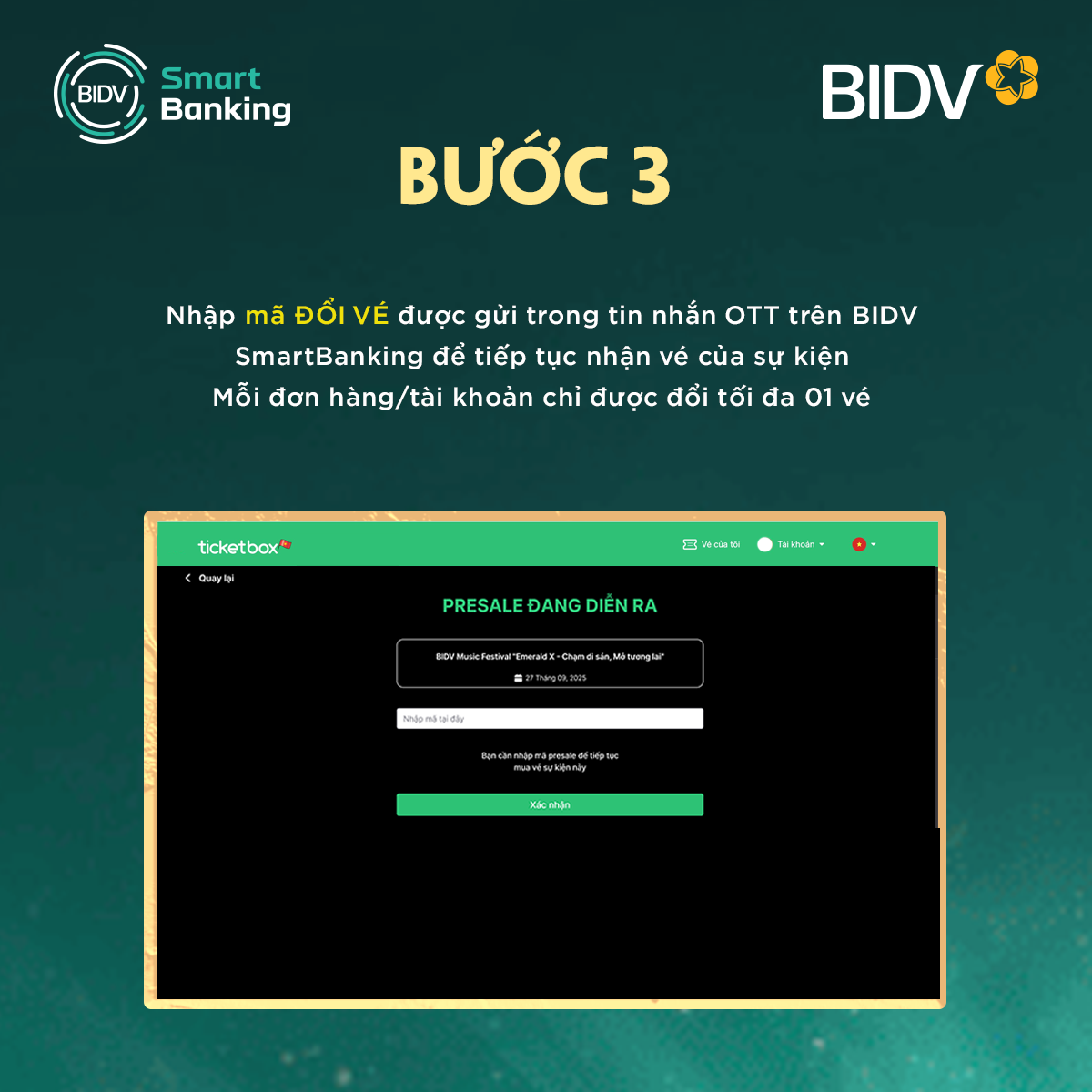 + Trước 20/09: KH đủ điều kiện giao dịch được nhận mã đổi vé thông qua tin nhắn OTT trên ứng dụng BIDV SmartBanking. + Ngày 22/09 đến hết ngày 24/09: KH thực hiện đổi vé Online tại https://ticketbox.vn/ + Sau khi đổi vé thành công, khách hàng nhận vé Online qua email đã đăng ký. |
