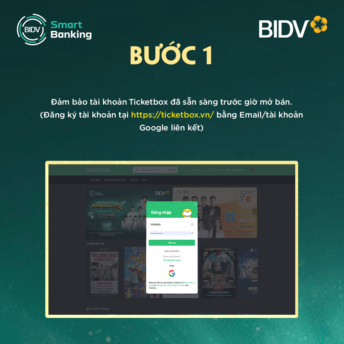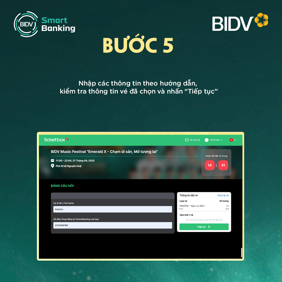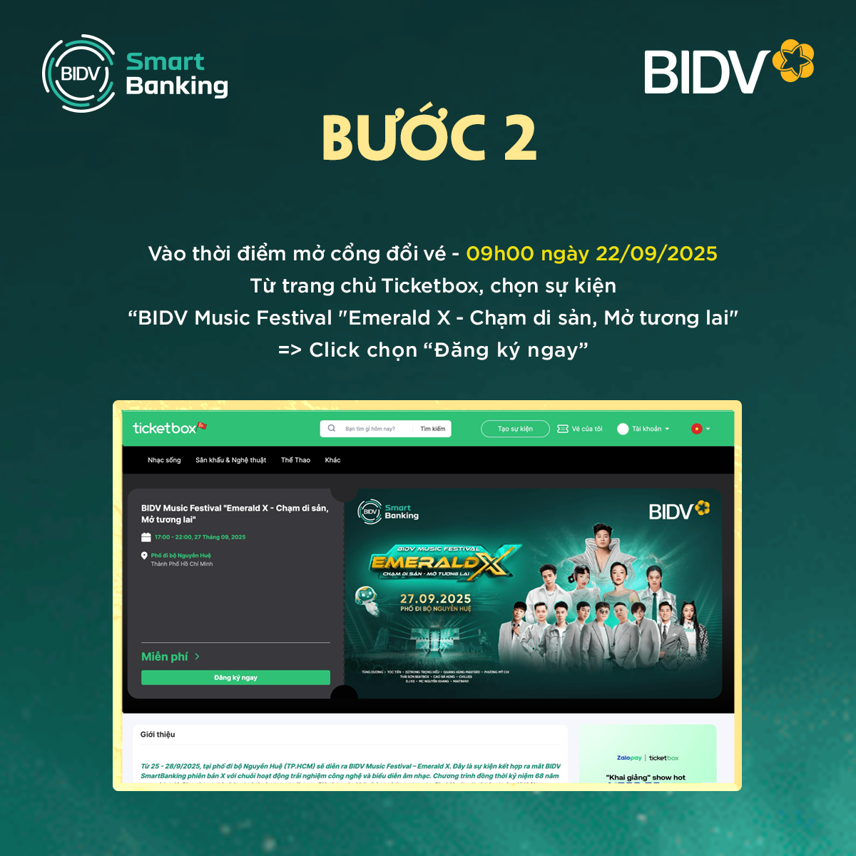 + Trước 20/09: KH đủ điều kiện giao dịch được nhận mã đổi vé thông qua tin nhắn OTT trên ứng dụng BIDV SmartBanking. + Ngày 22/09 đến hết ngày 24/09: KH thực hiện đổi vé Online tại https://ticketbox.vn/ + Sau khi đổi vé thành công, khách hàng nhận vé Online qua email đã đăng ký. |