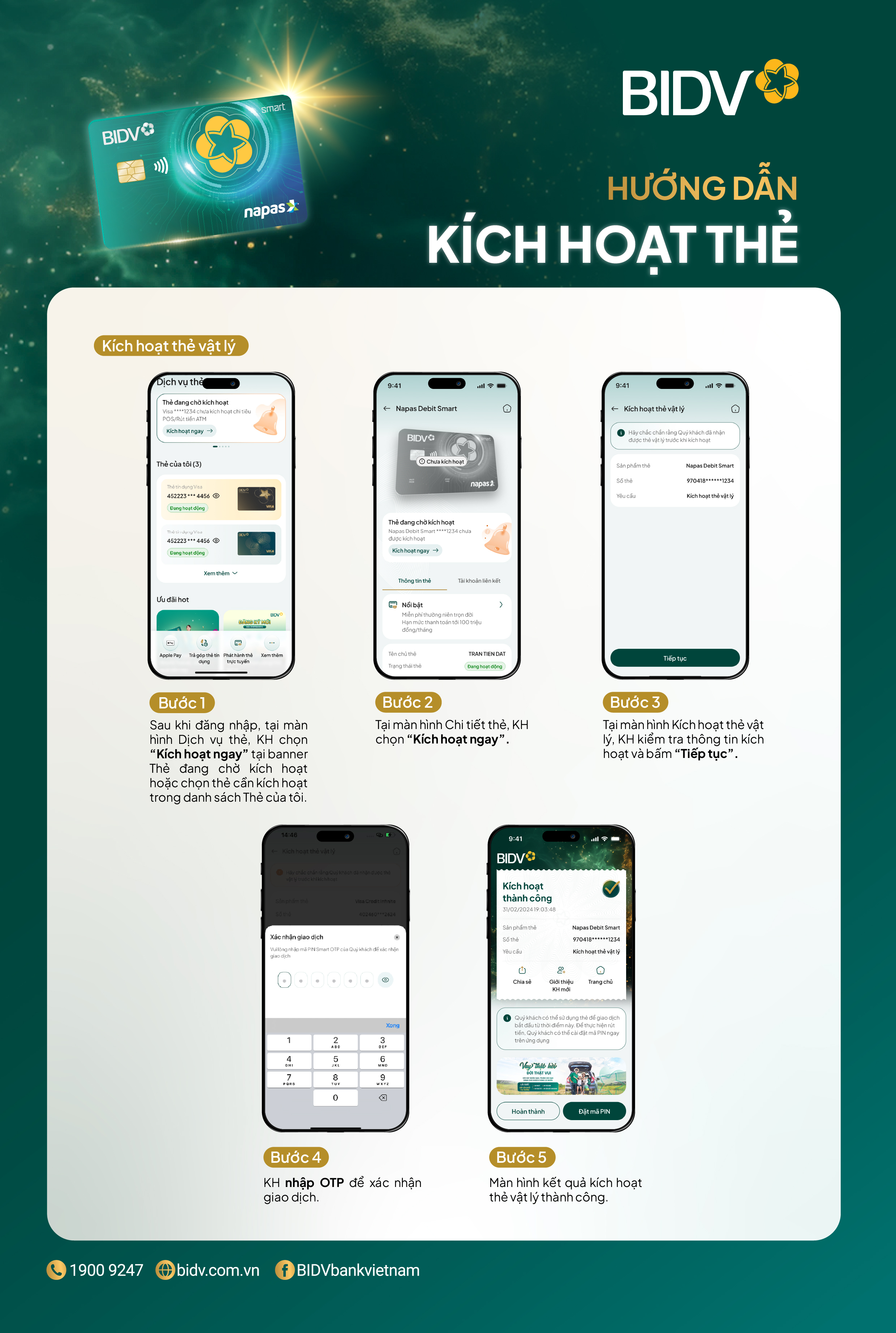 Sau khi thẻ được phát hành thành công, chủ thẻ chủ động kích hoạt thẻ và đặt mã PIN thẻ trên ứng dụng BIDV SmartBanking.