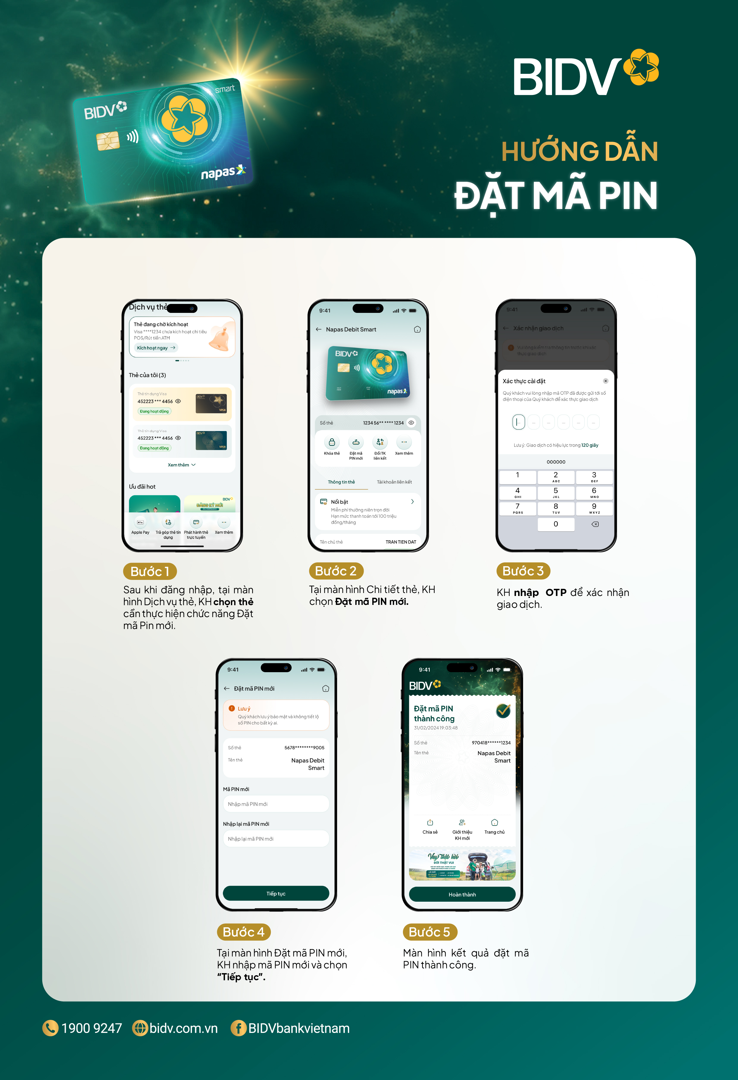 Mọi vướng mắc trong quá trình thực hiện, Quý khách xin vui lòng liên hệ hotline 19009247, Email: bidv247@bidv.com.vn, Chat với BIDV tại website bidv.com.vn; ứng dụng Smartbanking hoặc các hiện diện MXH chính thức của BIDV trên kênh Facebook, Zalo hoặc liên hệ chi nhánh BIDV gần nhất. Trân trọng cảm ơn Quý khách!