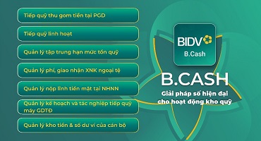 B.Cash là hệ thống số hóa toàn diện hoạt động tiền tệ – kho quỹ trong toàn hệ thống BIDV, hướng tới tự động hóa, chuẩn hóa và minh bạch hóa toàn bộ quy trình tác nghiệp. Hệ thống cho phép số hóa từng khâu trong quy trình nghiệp vụ, kiểm soát chặt chẽ mọi thao tác trên môi trường số; tất cả chứng từ giao dịch được tạo lập, lưu trữ điện tử, hoàn toàn loại bỏ chứng từ giấy, giảm rủi ro, nâng cao hiệu quả kiểm soát, giúp cán bộ thực hiện thao tác nhanh hơn, giảm thời gian xử lý và được hỗ trợ bởi các báo cáo thông minh phục vụ điều hành, quản trị rủi ro cũng như tối ưu nguồn lực.